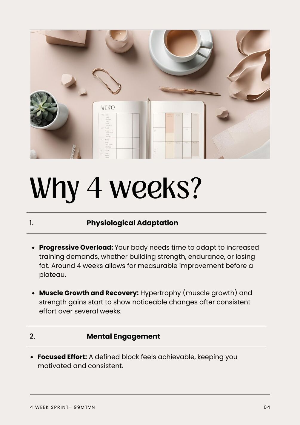 - Why 4 Weeks?: Benefits of a focused sprint to achieve your fitness milestones.